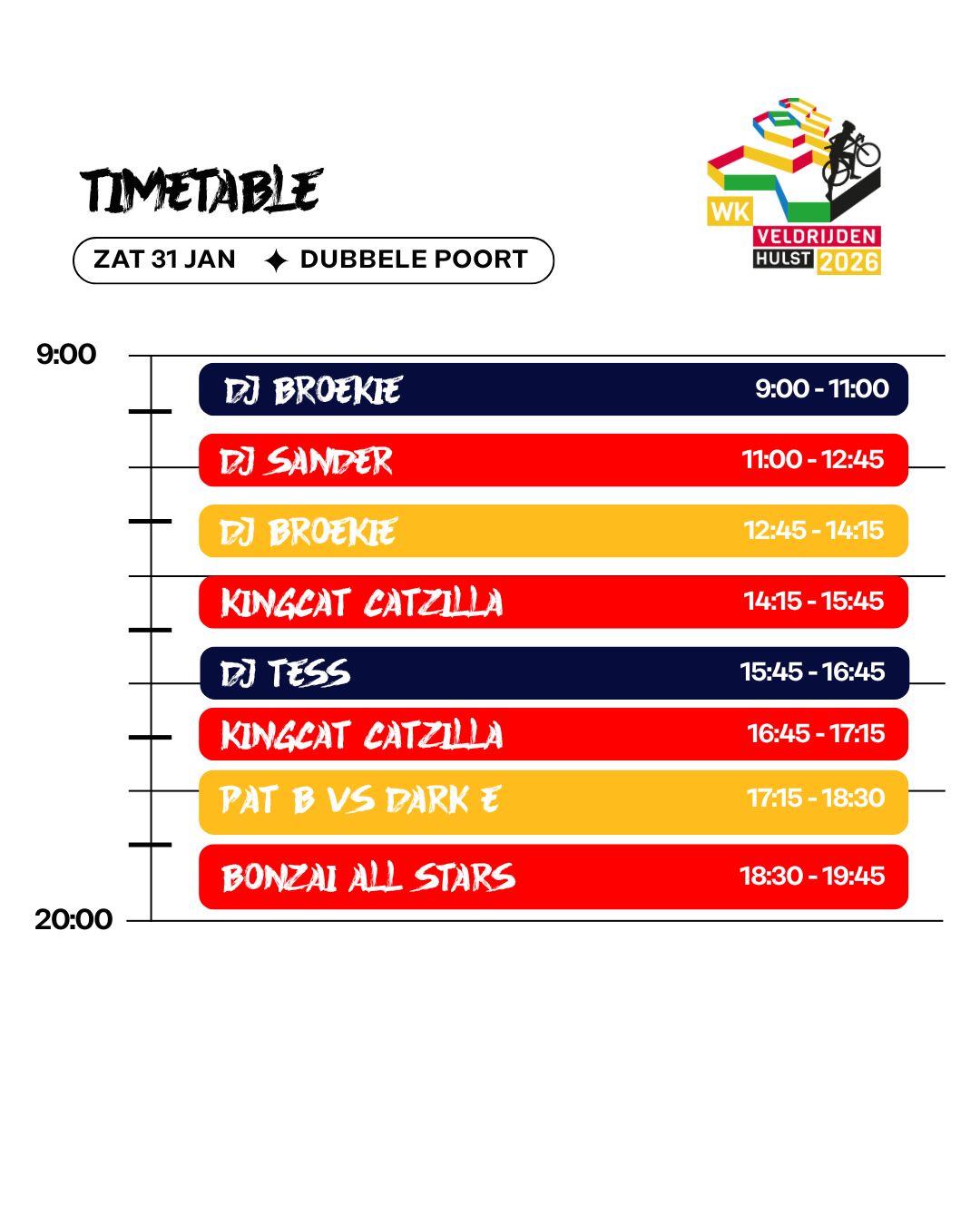 Between races, and especially after them, there is always music, atmosphere and action. This is Hulst as a cyclo-cross festival: energy, beats, party and sport brought together in one place. Come and watch, dance along and experience the 2026 Cyclo-cross World Championships like never before!